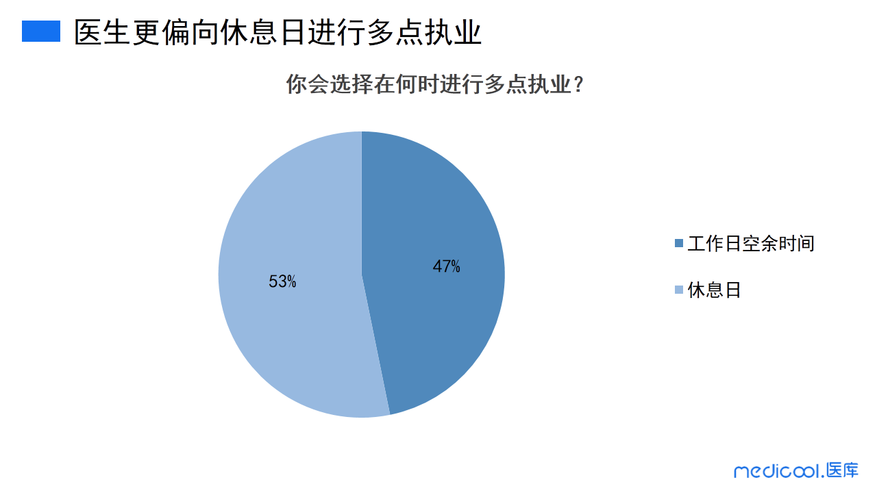 根据医生的选择数据,53%的医生会选择在休息日进行多点执业,47%的医生工作日空余时间进行多点执业。