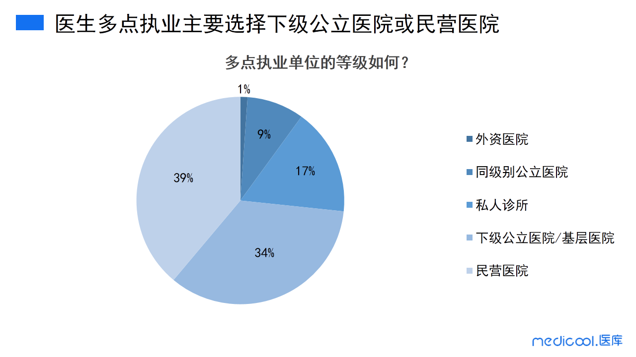 医生选择多点执业单位等级如何呢?39%的医生选择民营医院进行多点执业,34%的医生选择下级公立医院或基层医院进行多点执业,17%的医生选择私人诊所进行多点执业,有9%的医生会选择同级别的医院进行多点执业,仅1%的医生会选择外资医院多点执业。可以看出,民营医院、下级公立医院或者基层医院是大多数医生的选择。