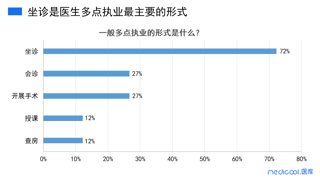 医生多点执业一般会以什么样的形式进行呢?坐诊是医生们多点执业最主要的形式。其次,会诊、开展手术也是多数医生会选择的。少数医生也会选择授课、查房的形式进行多点执业。