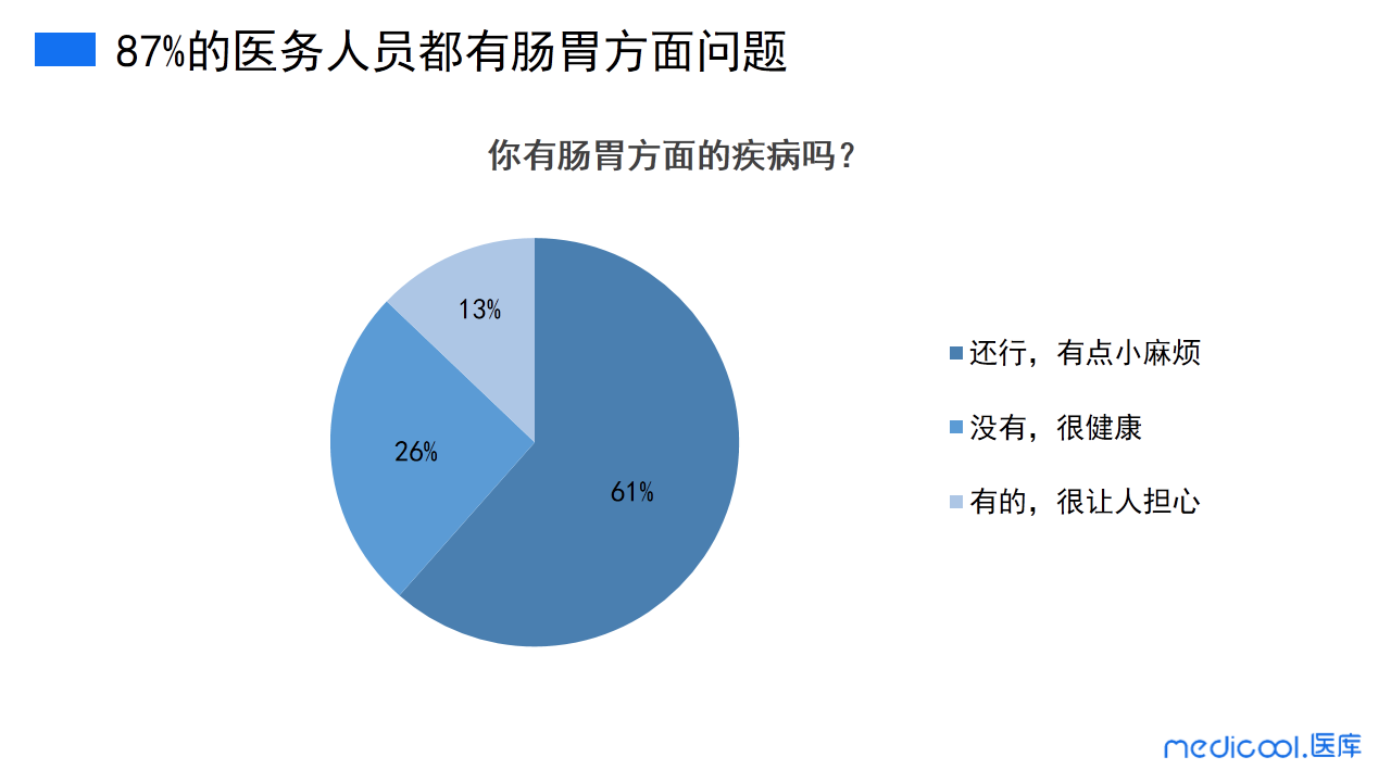 此次调研数据显示,61%的医务人员肠胃有点小问题,13%的医务人员有肠胃方面的疾病,很让人担心,剩下26%的医务人员表示肠胃很健康。