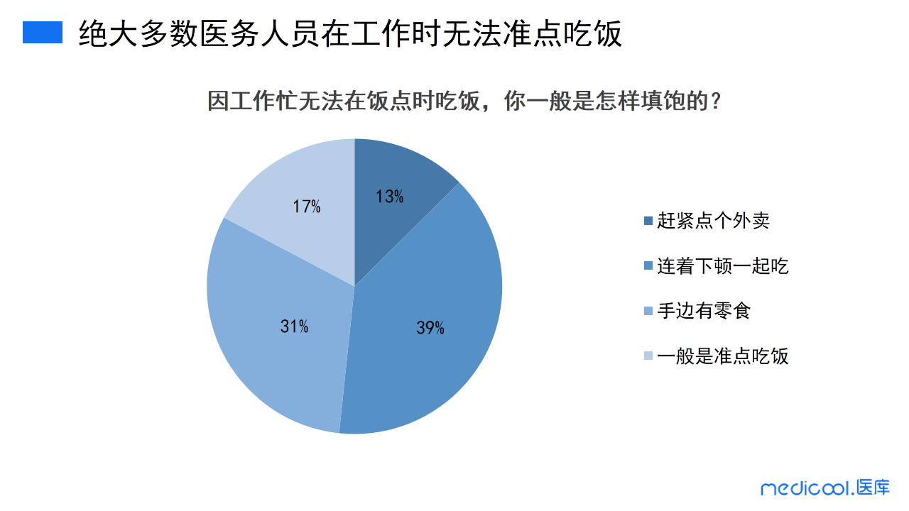 调研数据显示,13%的医务人员一般会选择点个外卖来填饱肚子;39%的医务人员错过饭点,干脆就连着下顿饭一起吃;31%的医务工作者手边常备零食,过了饭点,就吃点零食充饥;仅有17%的医务人员一般是准点吃饭。