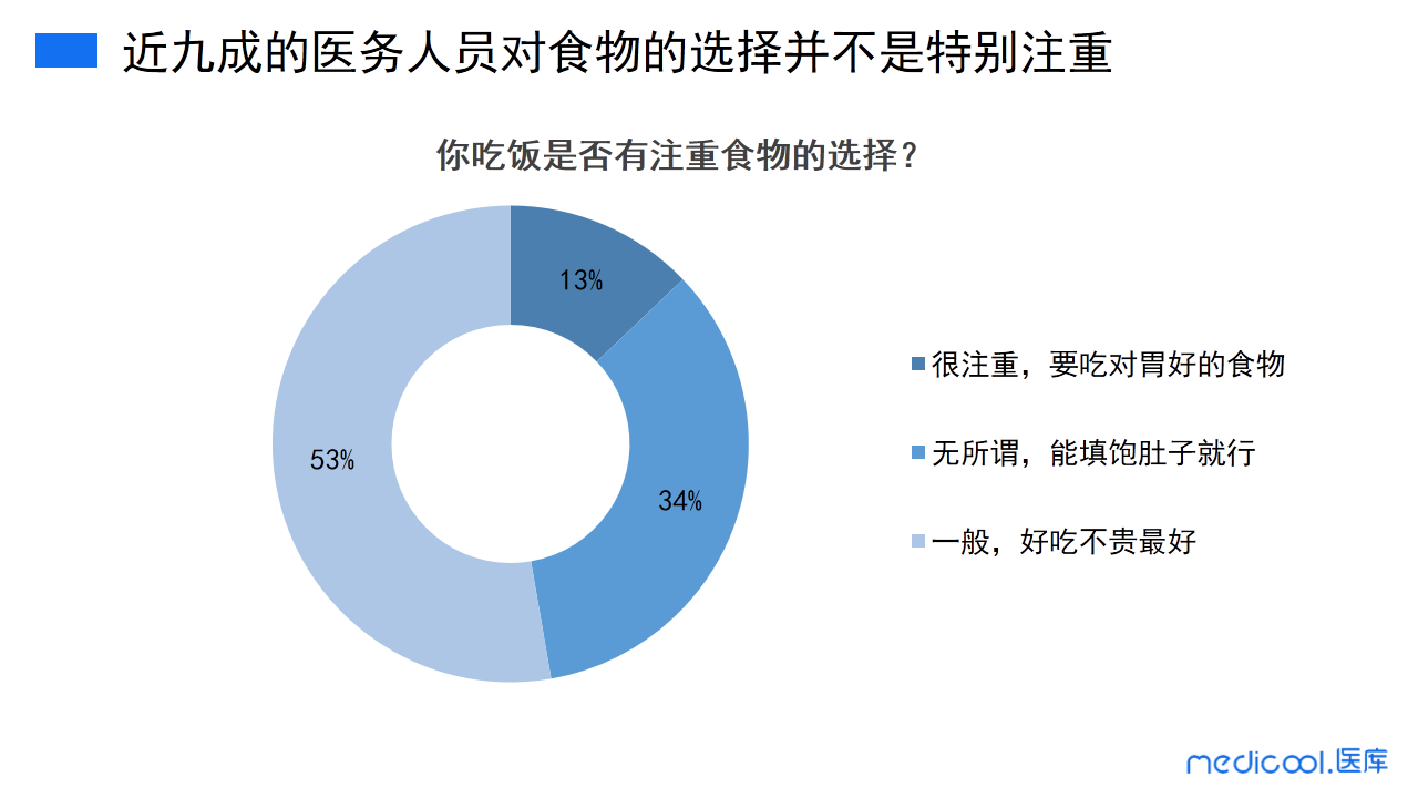 另外,从我们的数据来看,仅有13%的医务人员会很注重对食物的选择,选择吃对胃好的食物;53%的医务人员吃饭时会选择好吃不贵的食物;34%医务人员对于食物的选择呈现出无所谓的态度,只要能填饱肚子就行。
