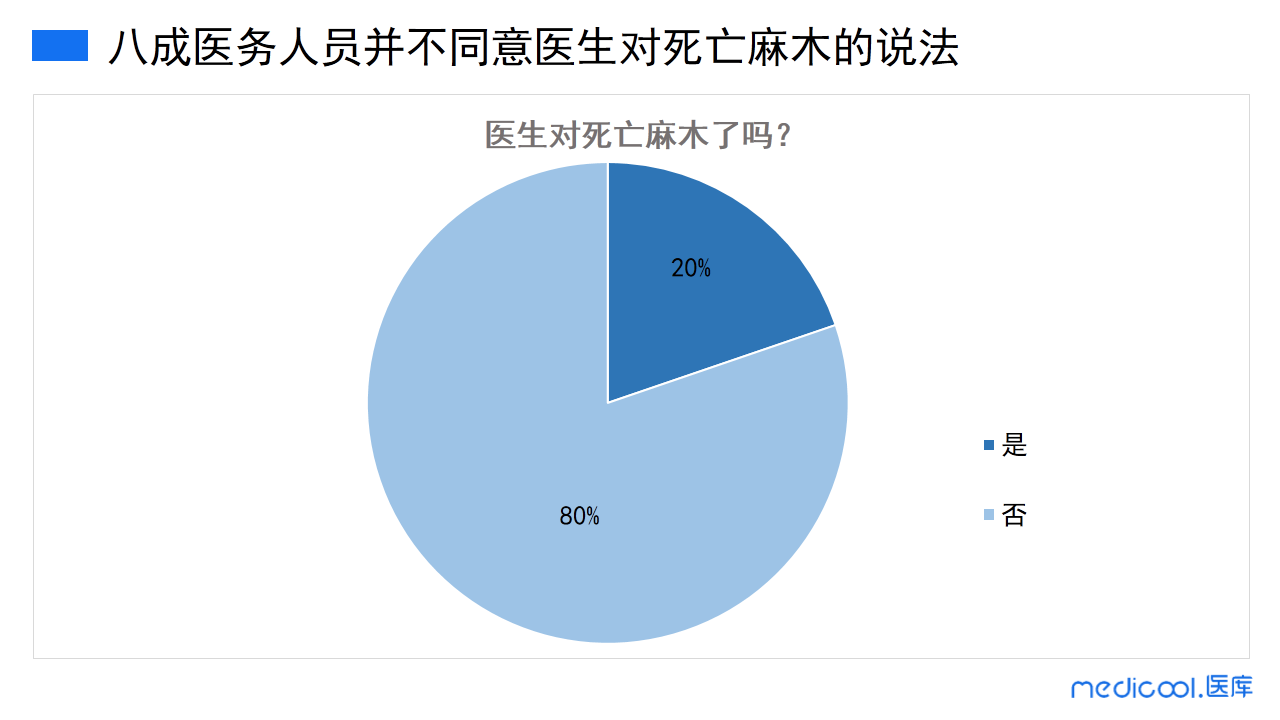 根据调研数据显示,80%的医务人员不同意医生对死亡麻木的说法,20%的医务人员同意医生对死亡麻木的说法。