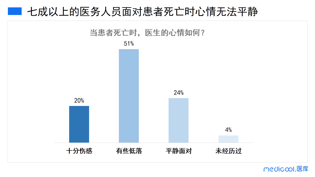 有人说医生见惯了生死,对死亡早已麻木,但事实是有80%的医务工作者不同意医生对死亡麻木的说法。当面临患者死亡时,20%的医务工作者仍然会十分伤感,51%的医务工作者情绪会有些低落,24%的医务工作者会平静地面对。