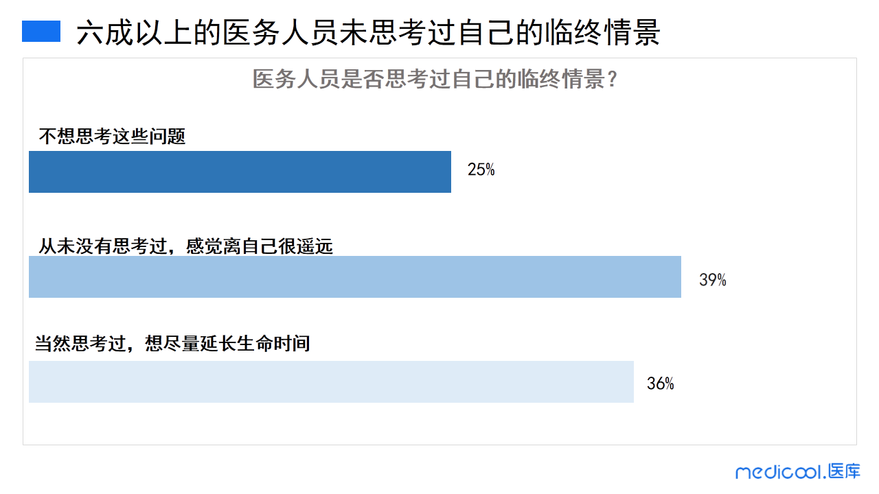 参加此次的医务工作者中,36%的医务工作者有思考过的自己的临终情景,想尽量延长生命时间;39%的医务工作者从未思考过自己的临终情景,感觉离自己很遥远;25%的医务工作者不想思考关于死亡的问题。