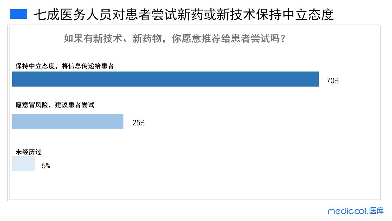 根据调研数据显示,70%的医务工作者保持中立的态度,会将新技术、新药物的信息传递给患者;25%的医务工作者表示愿意冒风险,建议患者去尝试新技术、新药物。