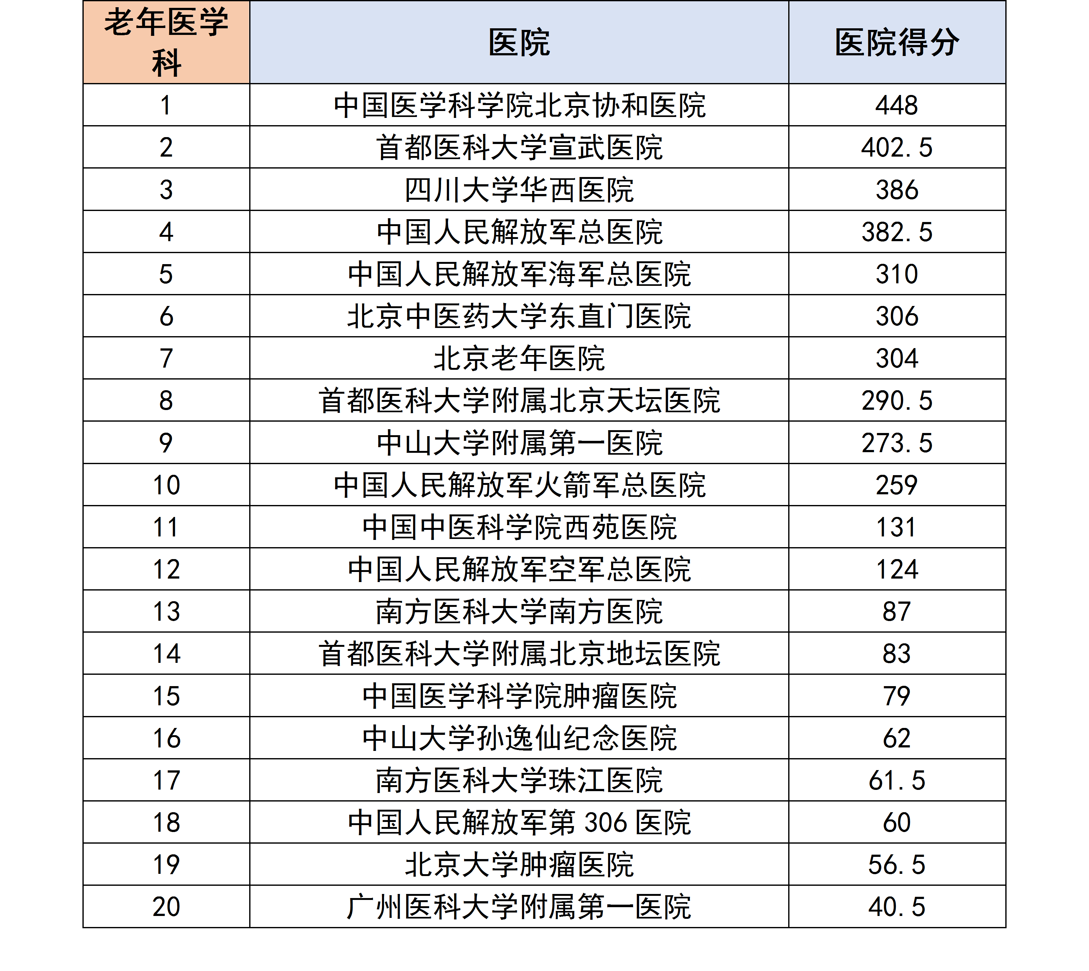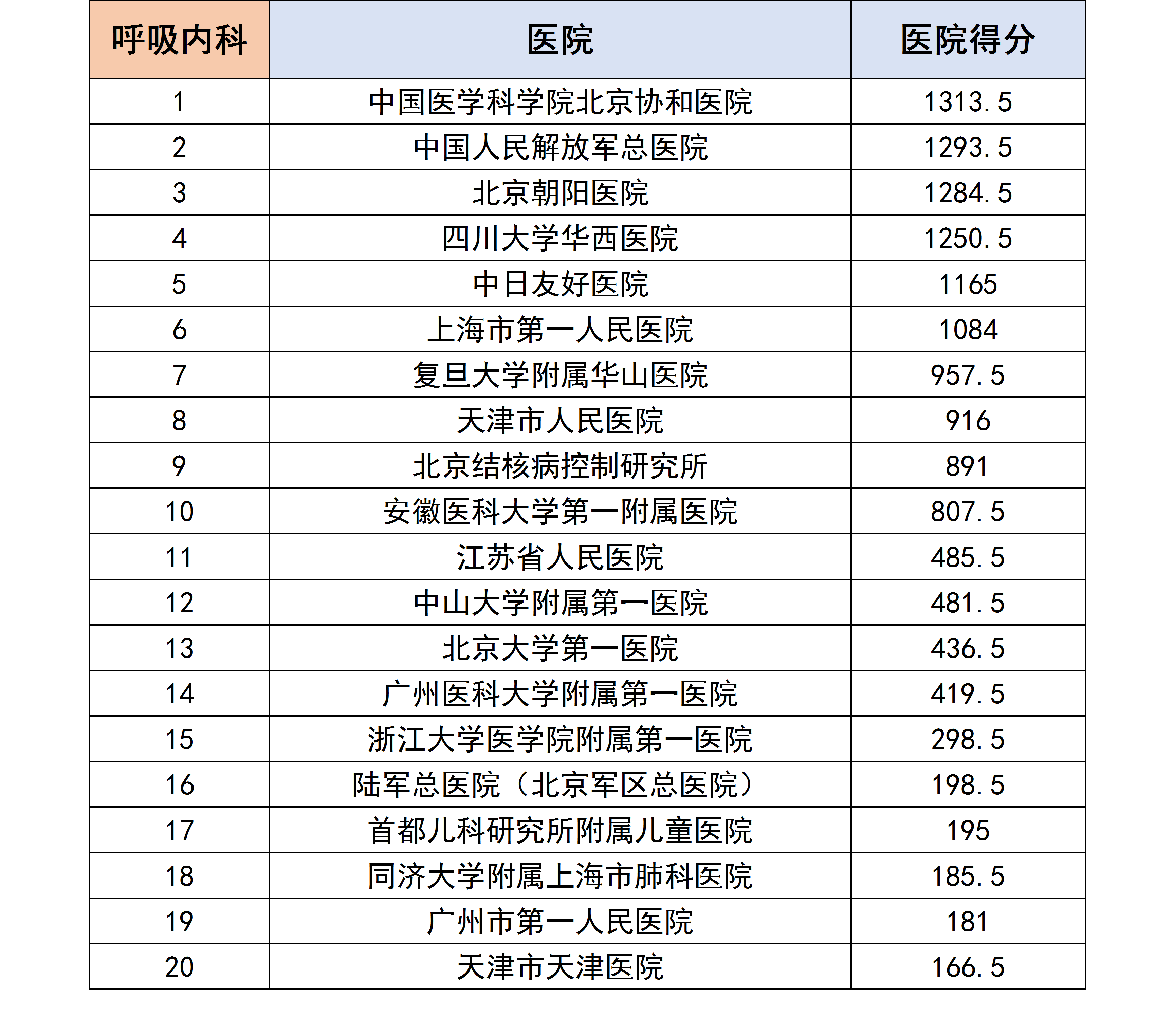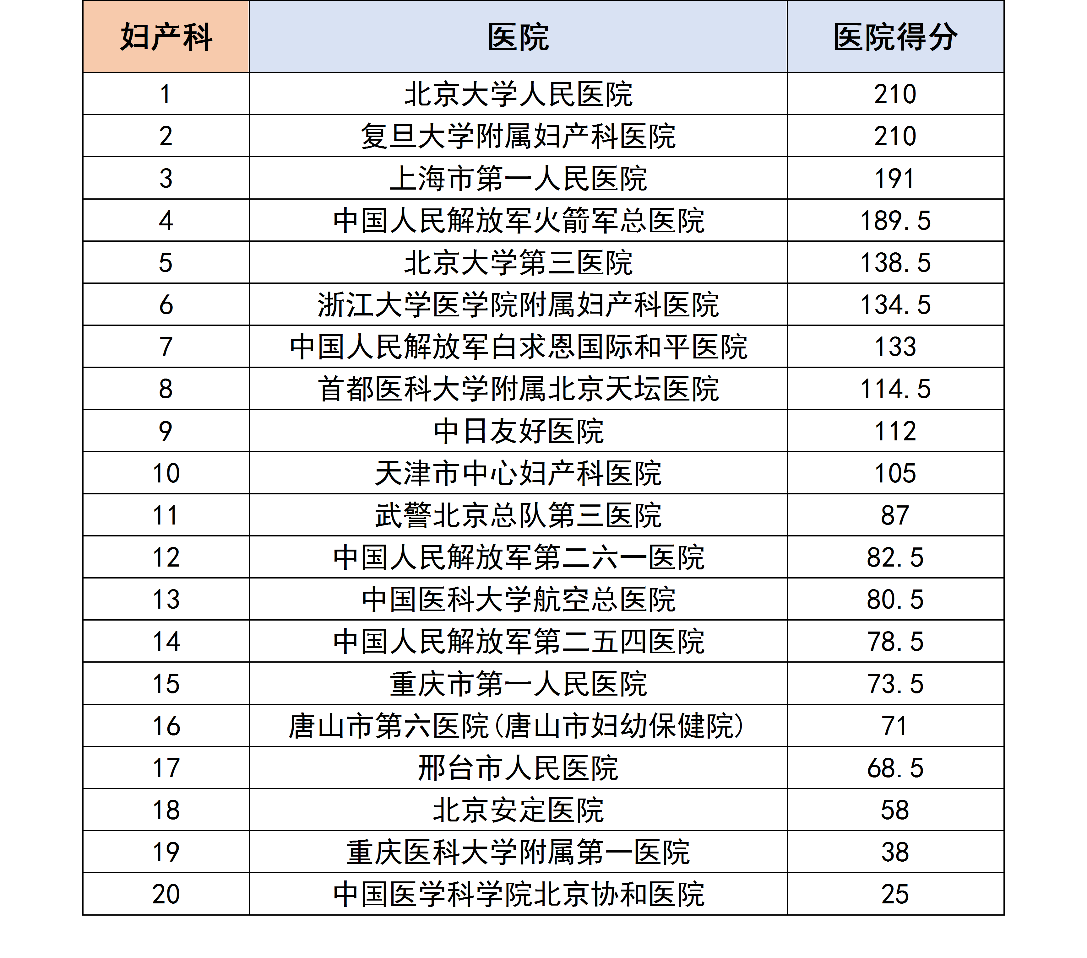 各个专科下的医院进行分数统计后,获得了以下各个分科室的专科排行榜。