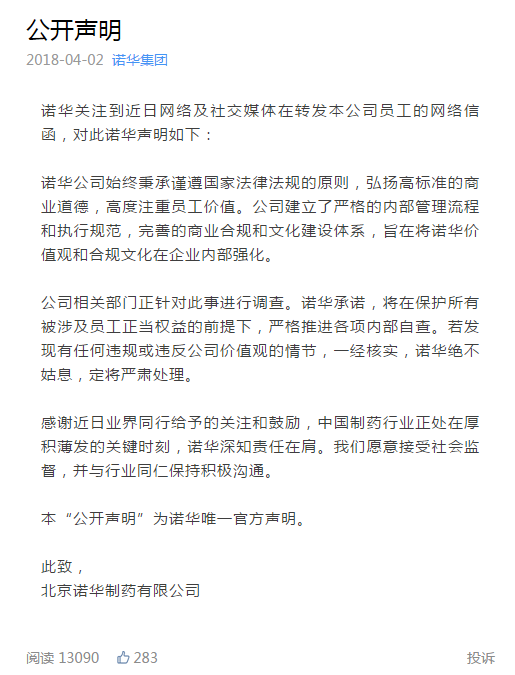 - 4月2日,诺华在微信公众号上发布《公开声明》,称公司的相关部门正针对此事进行调查。