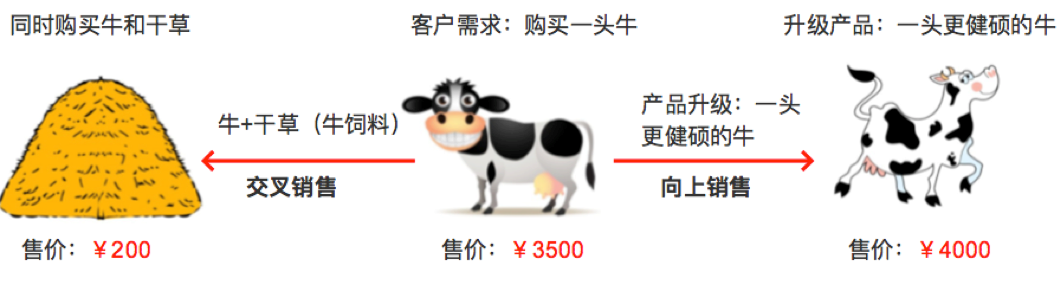 客户从购买售价3500元的牛,改变为4000元购买那头更健硕的牛,这种销售方式即为向上销售。总结来说向上销售指的就是,向顾客销售某一特定产品或服务的升级品、附加品、或者其他用以加强其原有功能或者用途的产品或服务。这里的特定产品或者服务必须具有可延展性,追加的销售标的与原产品或者服务相关甚至相同,有补充或者加强或者升级的作用。