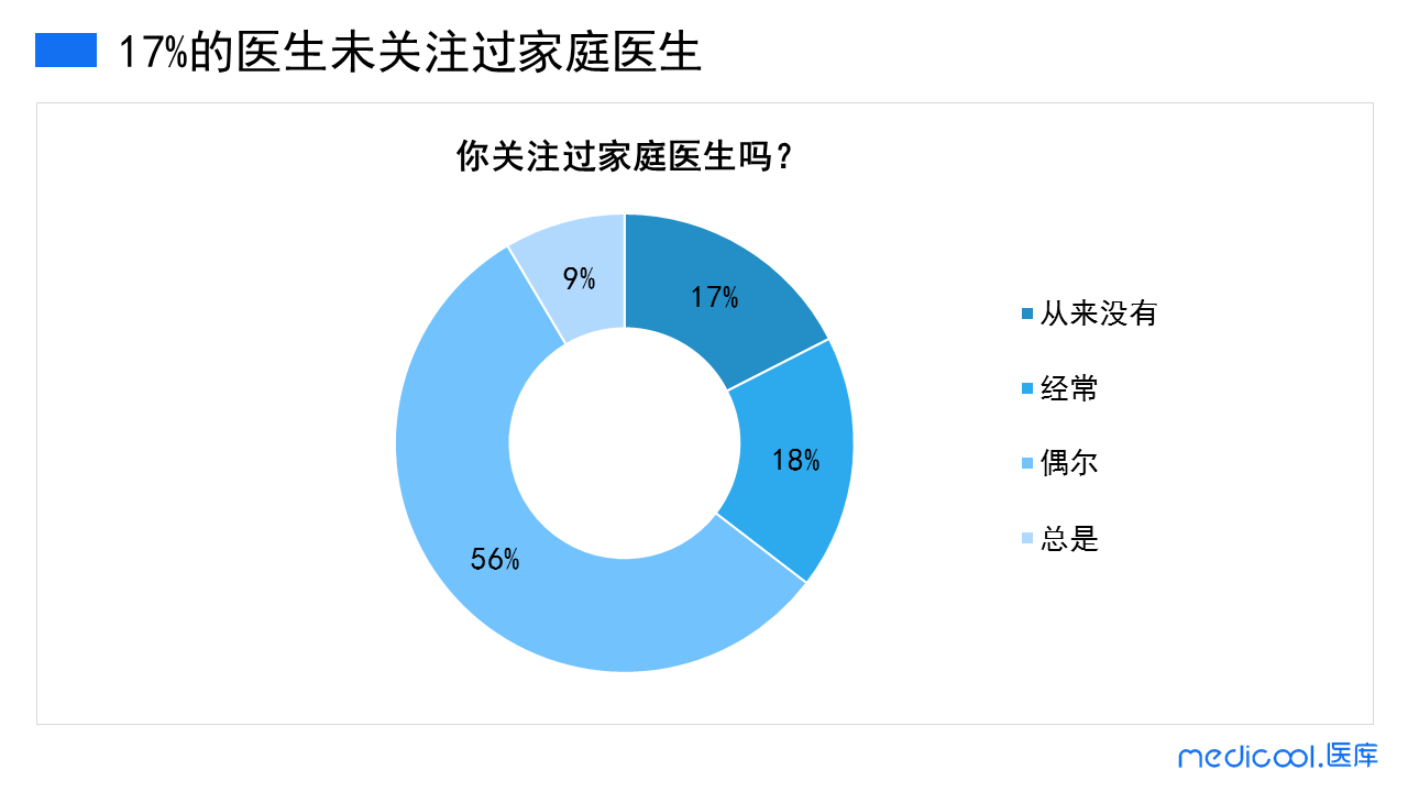 本次调研中,17%的医生表示从来没有关注过家庭医生,仅有9%的医生表示经常关注此类的政策制度。