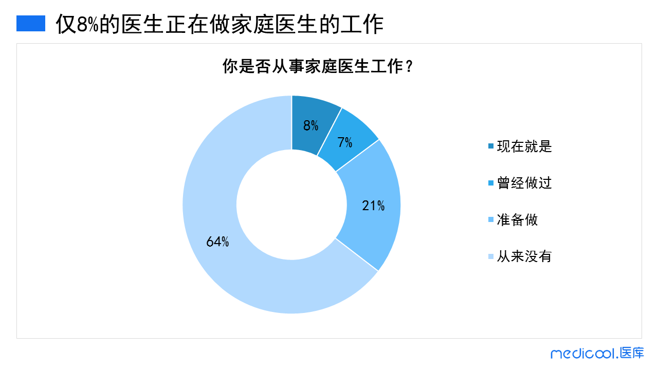参加本次调研的医生中,仅有8%的医生目前正从事家庭医生工作,7%的医生曾经做过家庭医生,二成医生准备往这方面发展,出乎意料的是,绝大多数的医生从没想过从事家庭医生的工作。
