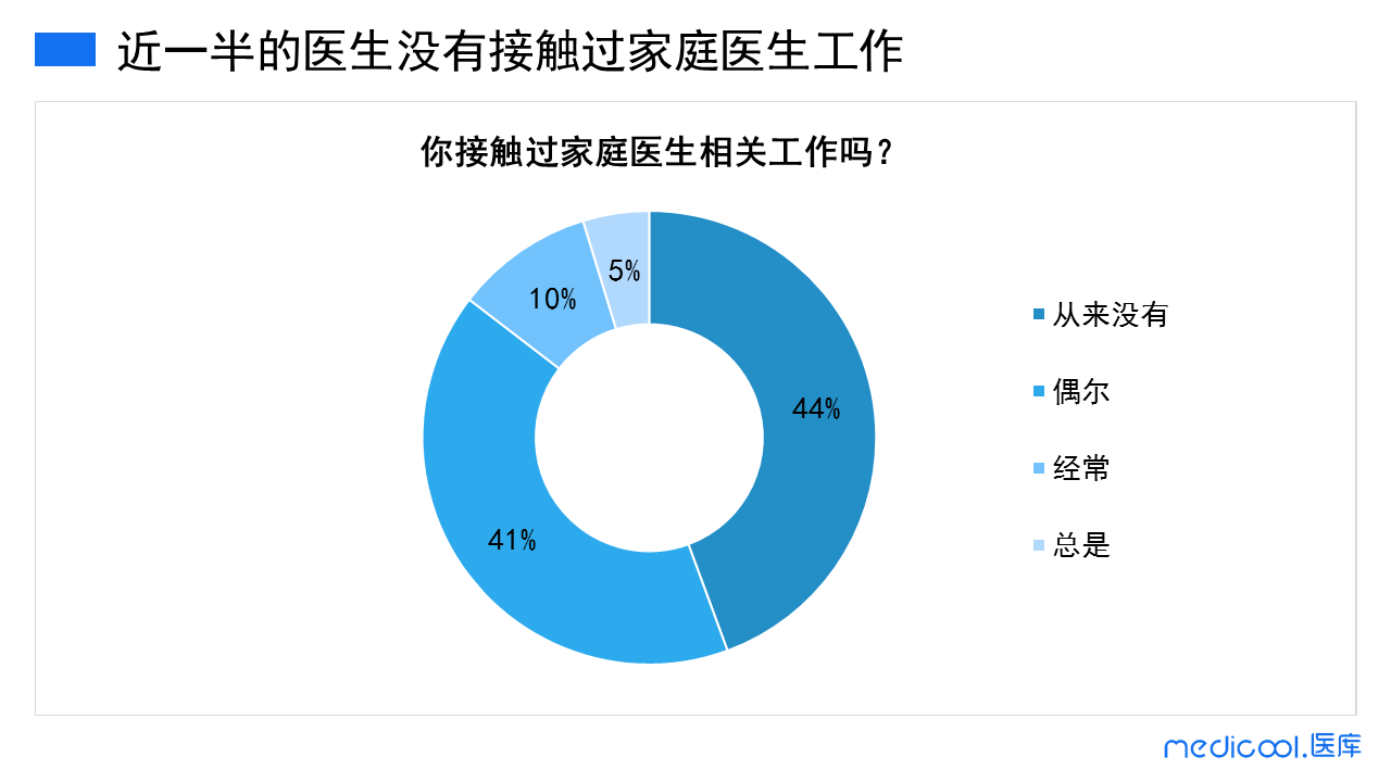 调研数据显示,44%的医生表示从未接触过家庭医生的相关工作。而只有很少一部分的医生的工作与家庭医生紧密相关。