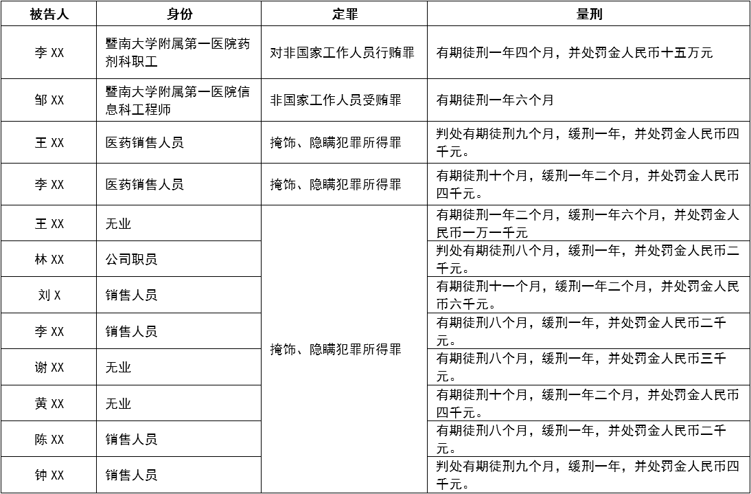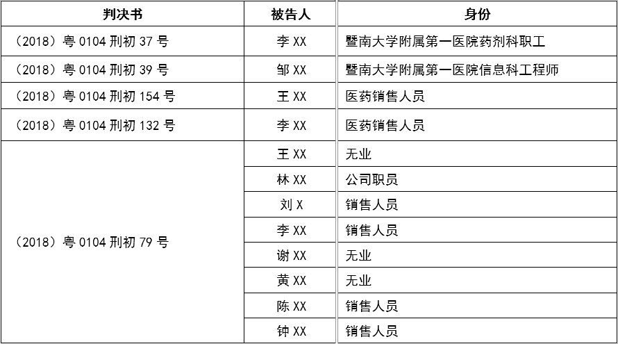 12名被告中,其中2人为暨南大学附属第一医院的职工,10人为医药销售人员或者曾经从事过此项工作。可见买卖统方的双方都被判处了刑罚。在判决书中我们看到,多人已经不做医药代表了,如王XX、黄XX都已经不做药代且处于无业状态,而林XX已经换了工作转做公司职员了,但他们仍然因为购买过统方数据而被定罪量刑。因此,只要购买过统方数据,风险就存在,不会因为转行就消失。