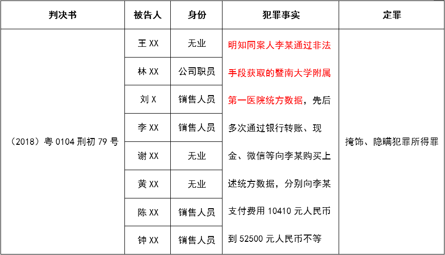 (2018)粤0104刑初79号判决书显示,8名被告都是从另一名医药代表李某处购得暨南大学附属第一医院统方数据,均被认定为刑事犯罪。其中一名被告辩称其主观上并不清楚李某如何获得医院统方数据,以此希望不构成主观故意。但是,判决书对此均认定为主观上“明知同案人李某通过非法手段获取的暨南大学附属第一医院统方数据......”。