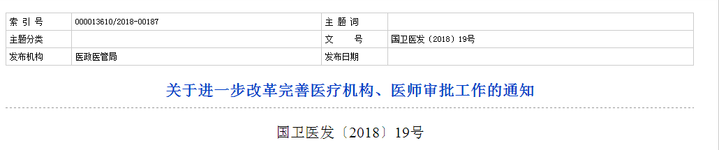 为深入贯彻落实党的十九大精神和国务院廉政工作会议关于深化“放管服”改革的重要部署,在医疗领域持续优化审批流程、提高审批效率,更好地发挥卫生健康行业主管部门作用,根据《中共中央办公厅国务院办公厅印发〈关于深入推进审批服务便民化的指导意见〉的通知》,现就进一步改革完善医疗机构、医师审批工作通知如下: