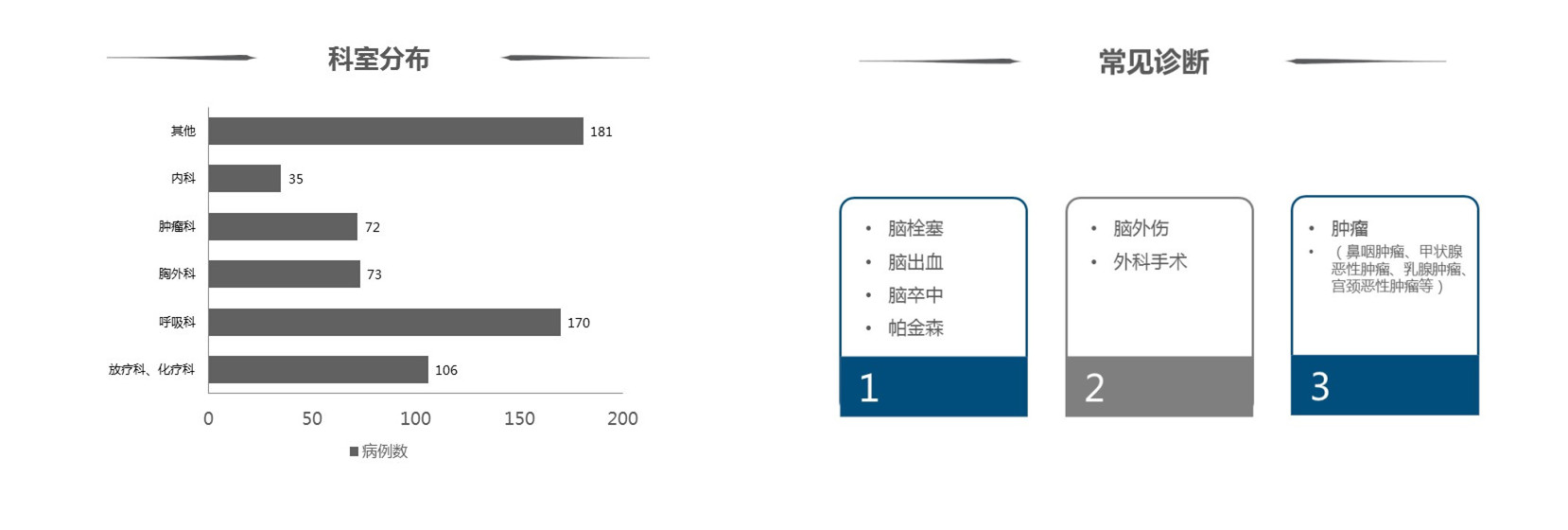 科室分布和常见诊断图中,我们可以看到处方来源,这些病例主要来自哪些科室,是否与市场预算投入成比例。根据病例中常见的症状和诊断判断是否有遗漏的科室,如果有,那么市场部在下一阶段的市场计划中就要着重关注被遗漏的科室。