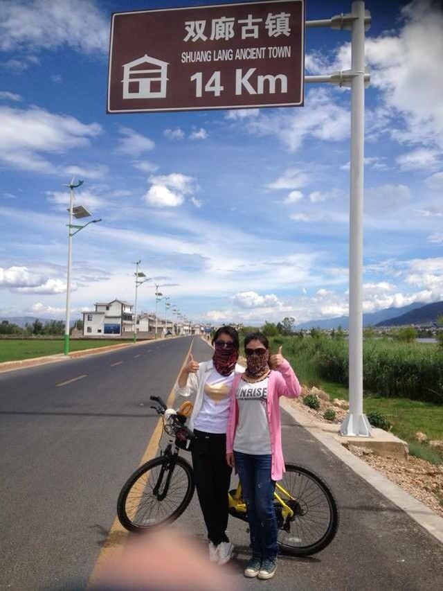 第二天起了大早,早饭吃的饱饱的,带了足够的水就出发了。从古城骑到环海公路一路都有指示牌,完全不用担心会迷路。一路向前,穿过村庄,骑上小坡,不时的会碰到同样骑着车向双廊进发的同道者。遇上了便一起骑行,累了就各歇各的,然后期待下次相遇。虽然不知道姓名,不知道来历,但却可以一起欢乐的追赶,一起各种搞怪合照,在这苍山洱海之间所有的拘束都暂且被抛到一边。