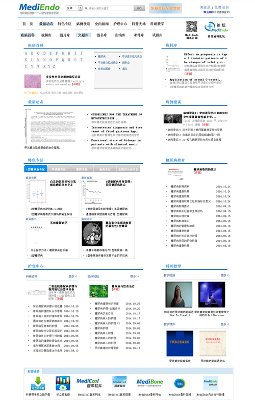 网站主要分为“最新动态”、“特色专区”、“病例漫谈”、“业内新闻”、 “护理中心”、“科普天地”、“科研教学”七大模块。另外,网站还设立资料库,包括疾病百科、视频库、图片库、文献库、图书库、指南库、课件库、和试题库,协助医师快速全面查找资料,帮助学生系统学习内分泌科知识。